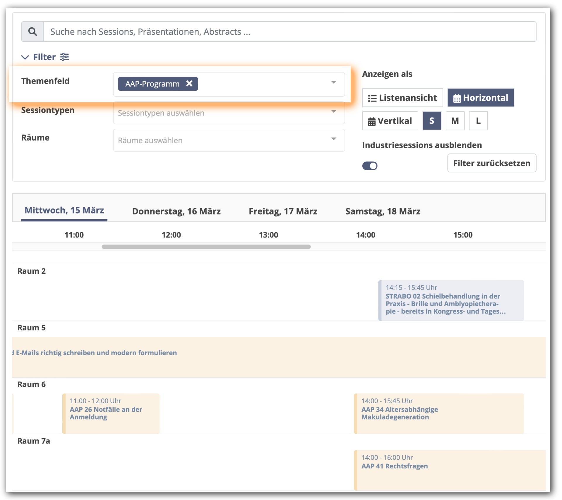 Um alle Kurse, die 2023 für AAP buchbar sind, anzuschauen, wählen Sie im Filter auf der Seite Programm – interaktiv einfach bei Themenfelder „AAP-Programm“ aus. Die untere Abbildung zeigt, wo Sie den Filter auswählen können.