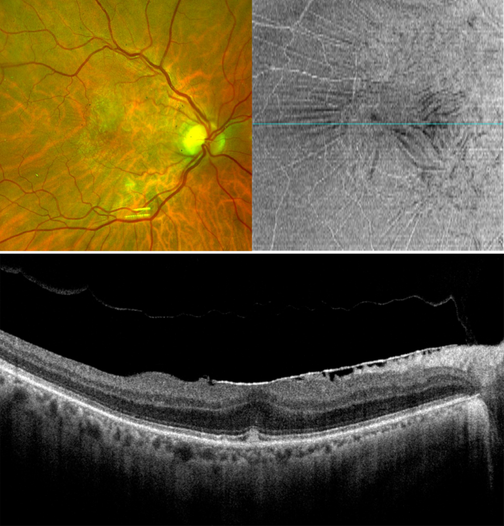 Abbildung: So lässt sich eine epiretinale Gliose mit verschiedenen diagnostischen Methoden darstellen: Die Laser-Scanning-Ophthalmoskopie (links oben) zeigt eine weiß-graue Membran mit Netzhautfalten im Bereich der Makula. Die Enface optische Kohärenztomographie der Makulaoberfläche (rechts oben) verdeutlicht Traktionsrichtungen und Netzhautfalten. Die hochauflösende optische Kohärenztomogaphie (unten) zeigt einen Scan durch die Fovea mit der epiretinalen Membran als hochreflektive helle Linie auf der Netzhautoberfläche.